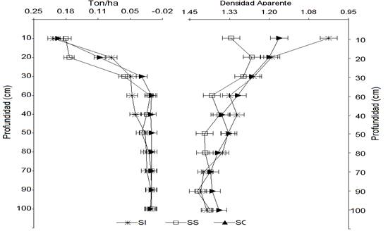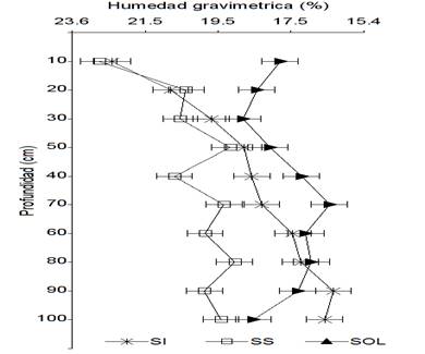 The agroforestry arrangements with cocoa have a diversified structure, which influences the behavior of fine roots, whose distribution is influenced by different cultural practices. The objective of the present work was to study the distribution, the contribution of biomass of fine roots in relation to the apparent density and the percentage of humidity in agroforestry arrangements with cocoa in the CIMAZ Macagual Research Center (1°37'LN and 75°36'LW). The sampling was developed in three agroforestry arrangements with cocoa classified in intense shade, semi-shade and full sun. For the extraction of the biomass of roots the cylinder of known volume was used every 10cm until reaching 1m of depth. The fine roots were extracted through a mesh size <2mm. There were significant statistical differences between the array-depth interaction for the variable root biomass (<0.001) with a positive correlation (0.26) between weight and bulk density. The highest accumulation of root biomass occurred between the first 20 cm of depth in the three systems studied, where the apparent density increases in the different soil profiles; in turn, the gravimetric humidity was greater in the agroforestry arrangements than in cocoa in full sun, showing significant differences (P<0.001) with a negative correlation (-0.75) in terms of the depths. In this sense, agroforestry systems favor the availability of water in the first soil profiles, increasing the presence of fine roots.