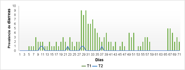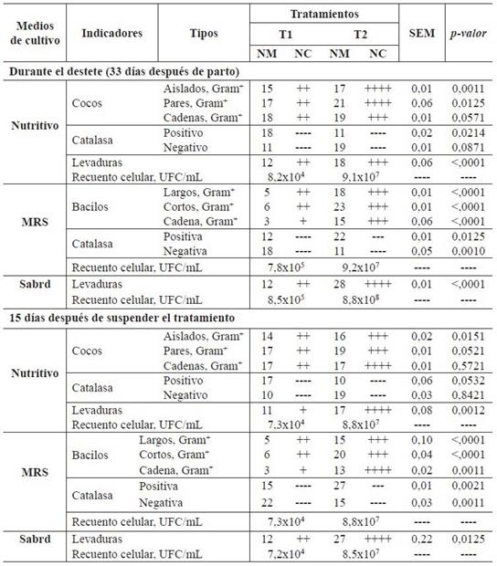 Probiotic additives contain beneficial microorganisms that included in the diet, in sufficient quantities, have a positive effect on the health of the host. However, high costs have limited its use in pork producers in developing countries. With the objective of evaluating the bioproductive behavior in breeding sows and their offspring when bioprepared in the diet is complemented. We used 12 hybrid breeding sows CC21 (Yorkshire-Landrace/L35 Duroc) and their descendants, divided into two groups of six animals each. T1, control and T2, treatment. T2, contained Lactobacillus acidophilus, Streptococcus thermophilus and Kluyveromyces fragilis (L-4 UCLV). A completely randomized design was used, the weight gained and the reproductive behavior in the offspring were evaluated; Weight gain in piglets from birth to pre-fattening, diarrheal cases and mortality, and the morpho-teintorial characterization of the microorganisms from the rectal swab. The weight gain in mother sows and piglets was higher (P>0.05) in T2. The diarrheic cases and mortality were lower (P<0.05) in T2; with the morpho-teintorial characterization, higher microbial load (P<0.05) was observed mainly coconuts in chain and isolated, short and chain bacilli positive gram and yeasts. It is concluded that the inclusion of bioprepared in the diet of the breeding sows and their offspring improves the bioproductive behavior, reduces diarrhea and deaths and increases the microbial load with corresponding morpho-teintorial characteristic to Bacilli, gram-positive cocci and yeasts.