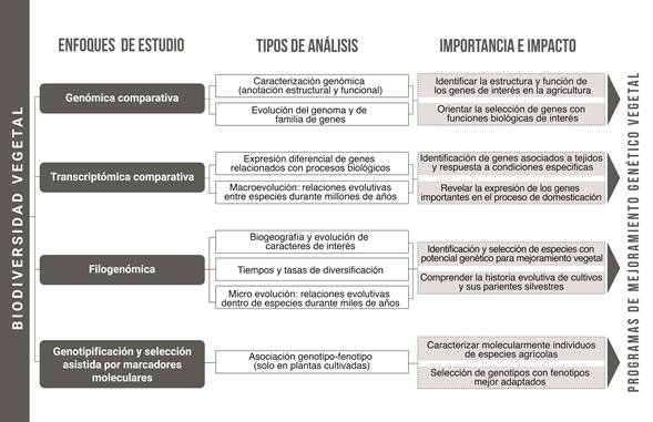 Population growth, climate change and the loss of ecosystem services are some of the challenges facing agriculture in recent decades to ensure long-term food security. Plant breeding programs can contribute to the development of genotypes adapted to new environmental conditions. The development and implementation of high-throughput sequencing technologies have accelerated breeding programs for crops that feed the world's population. This article reviews the main technological developments in “omics” used for genetic crop improvement. Here, we briefly discuss four technologies and their applications in the field of agriculture: phylogenomics, comparative genomics, comparative transcriptomics and marker assisted selection. These approaches allow to understand the evolutionary history of crops and their wild relatives, as well as identify the structure and function of genes of interest in agriculture. In addition, these help to reveal the expression of important genes in the domestication process and characterize individuals of agricultural species using molecular approaches that allow streamlining selection processes. It is necessary to implement genetic improvement programs that include the use of some or all of these technologies with the purpose of accelerating processes that can contribute to current agricultural challenges.