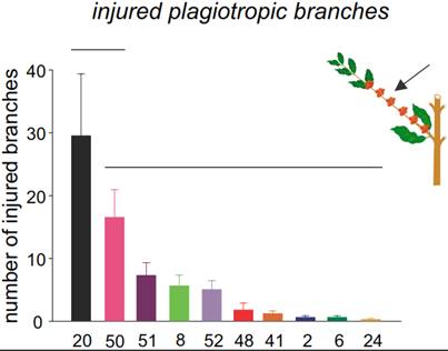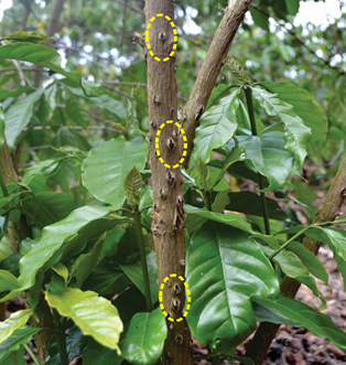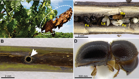 In robusta coffee, Coffea canephora, the black twig borer Xylosandrus compactus (Eichhoff) (Coleoptera: Curculionidae) causes considerable damage. Although this has been reported in many crops for years in Brazil, recently, the injury caused by X. compactus in coffee has been ignored. This present study aimed to report the current status of X. compactus in Brazil, and to investigate its attack frequency in different robusta coffee genotypes. In this study, we reported the occurrence of X. compactus in robusta coffee plants in the state of Rondônia for the first time. We also evaluated the occurrence of this pest in different robusta coffee genotypes in the state of Espírito Santo. In all plants, the plagiotropic branches were attacked; however, the genotypes G2, G6, G8, G20, G48, G50, G51 and G52 showed a high number of attacked plagiotropic branches, whereas the genotypes G24 and G41 showed a low attack frequency. Thus, these can be promising candidates for pest resistance studies. Moreover, it was reported that Almeidea rubra, Alseis floribunda, Plinia grandifolia and Casearia Sylvestris can serve as hosts of X. compactus. Thus, our findings suggest that X. compactus is a threat to coffee production, and that future studies are necessary to find appropriate tools for its management.