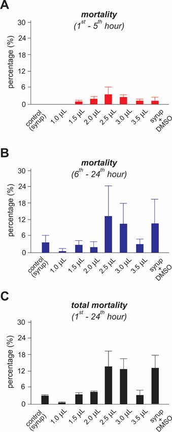 The use of plant essential oils has been adopted as less hazardous to the environment and human health than synthetic insecticides used for the control of insects that transmit diseases. Despite of exerting insecticidal activities against several insect disease vectors, the potential impacts on non-target organisms exerted by essential oils extracted from Lippia sidoides (Cham.) have not received adequate attention. Here, we evaluated the susceptibility and potential changes in consumption rates of honey bees, Apis mellifera (L.), when exposed to essential oils extracted from L. sidoides. Was exposed forager bees to honey syrup (50% v/v) containing L. sidoides essential oil for 5 h. After this exposure period, the bees received regular honey syrup for another 19 h period. Six essential oil concentrations was used, namely 1.0, 1.5, 2.0, 2.5, 3.0 and 3.5 µL of essential oil/mL of syrup, and evaluated the syrup consumption and bees mortality in both periods (at the 5th and 24th h). The results reveal that independent of the essential oil concentration, the forager bees fed significantly less on L. sidoides essential oil-containing honey syrup. However, feeding on L. sidoides essential oil-containing honey syrup did not cause significant mortality when compared with bees that were not exposed to the essential oils. Thus, the results demonstrate that L. sidoides essential oils exhibited adequate selectivity against honey bees.