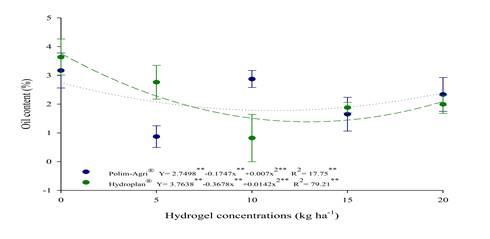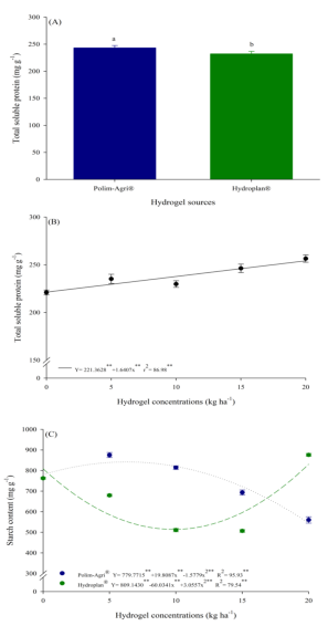 Investigations related to the effects of the hydrogel use in a water-deficit conditions on the biochemical composition of the harvested products are scarce. The aim of this study was to verify the influence of hydrogel on the biochemical response of cowpea beans produced under water-deficit in southern Tocantins. The experiment was a randomized complete block design  with  four  replications.  The  treatments  were  obtained  in  a  2x5  factorial  scheme,  being:  two  sources  of  hydrogel  (Hydroplan-EB  HyC  and  Polim-Agri PP) and five concentrations (0, 5, 10, 15, and 20kg ha-1). After harvesting,  the  grains  of  cowpea,  BRS  Vinagre  cultivar,  were  ground  and  chemically analyzed. The oil content of the seeds agreed with the reference values.  The  use  of  Polim-Agri  PP  promoted  the  best  levels  of  amino  acids  (0.38mg  g-1)  and  proteins  (243.22mg  g-1)  of  the  grains.  The  carbohydrate  content  of  them  (Ȳ= 81.44mg  g-1)  was  better  using  Hydroplan-EB  HyC,  regardless  of  the  concentration  applied.  The  application  of  6.28kg  ha-1 of Polim-Agri  PP  provided  the  highest  starch  content  (842g  mg-1).  The  use  of  hydrogel  improves  the  biochemical  quality  of  cowpea  beans  produced  under water deficit in southern Tocantins.