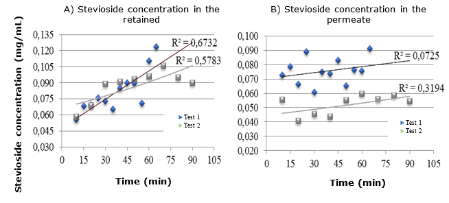 The modern consumer values those components that can promote their well-being and help them reduce the risk of diseases the use of steviolglucosides as a sweetener in the formulation of foods is promising. The study evaluated the tangential microfiltration for clarification and conservation of blackberry juice sweetened with dried leaves of stevia. Two ceramic membranes were evaluated. The tests were performed at 35°C in concentration mode at a constant transmembrane pressure and tangential velocity. The formulation of the juice was defined through sensory evaluation tests. Volume, flow permeate, temperature, and pressure input and output were registered. The results of the variables analyzed in the process, as well as the physicochemical characterization of clarified juice, helped define the operating conditions for draw two formulations of microfiltrated juice, sweetened with stevia or sucrose, and thus evaluate the effectiveness of microfiltration as a conservation treatment. Aciduric microorganisms were quantified; molds and yeasts were carried out in the generated pasteurized samples stored at five different temperatures (5, 20, 30, 37, and 45°C). The recovery permeate juice obtained was 84.62%. The permeate Flow (Jp), exhibited higher values at 40L/hm2. Also, the concentration of stevioside and rebaudioside A in the retentate increased with advancing ultrafiltration. A significant variation in color, turbidity, and soluble solids, was observed, unlike the pH. Also, its chemical and microbiological stability is confirmed that allows you to preserve quality during 27 days of storage.