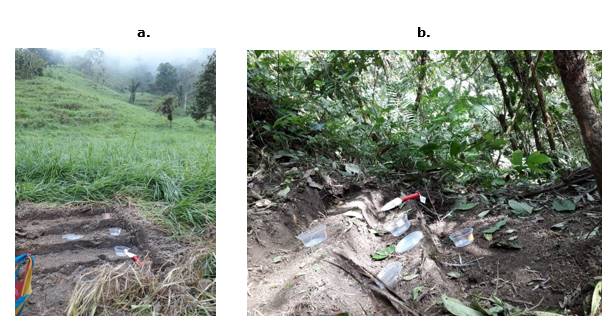 Soil is probably one of the natural resources most vulnerable to climate change. Composes most of the carbon stock in terrestrial ecosystems. The aims of this study were: to characterize the use of pastureland and native forest in two sites in El Oro province (Ecuador), based on their physical, chemical, and biological properties, and to compare the Soil Organic Carbon (SOC) stock at three depths. For this purpose, plots were established in Brachiaria sp pastures and native forests in the coastal area of Machala, Santa Inés site (SI), and the mountains of Chilla, Cune site (CN). Soil sampling was done at three depths (C1=0-10cm; C2=10-20cm; C3= 20-3 cm). The SI soils showed significance (p-value<0,05) among the stored SOC layers. The highest stored SOC value was for SI forest (C1, 36,30megagrams-Mg C ha-1), in an alkaline pH and clay loam texture. In CN soils, stored COS revealed no significance between layers, and values ranged from 27,64Mg ha-1(C1, CNforest) to 35,01 Mg C ha-1 (C3, CNpasture), in an acidic pH, sandy loam texture and high levels of Fe (761,71-938,34 mg kg-1). Soil properties play an important role in stored SOC levels; therefore, sequestration of SOC must be considered to develop optimal pasture management.