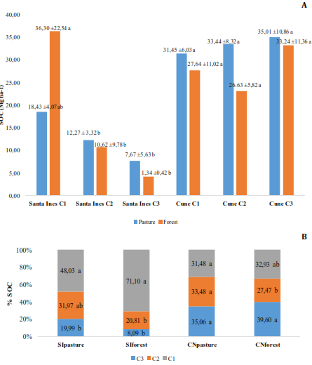 Soil properties and storage of organic carbon in the land use pasture and forest