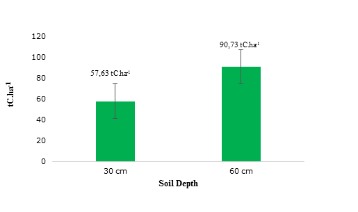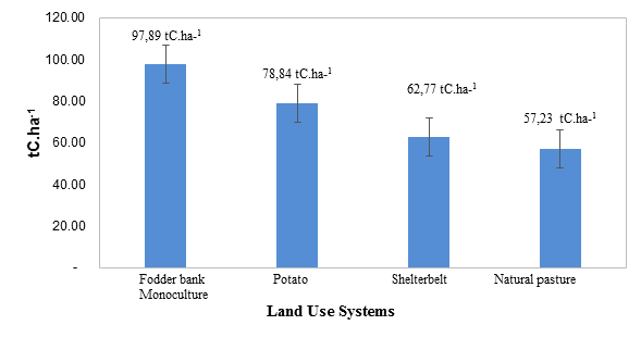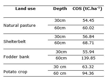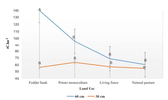 Carbon sequestration by soils in different production systems contributes greatly to the reduction of greenhouse gases. The objective of this study was to quantify the carbon stored in four land uses at different soil depths. To this end, a 22 factorial experiment in complete randomized block design (CRBD) was carried out. The factor A: land uses (natural pastures, shelterbelts, fodder banks, and potato crop) and the factor B: two soil depths (30 and 60cm), with three replications.  . As a result, statistical differences were found among soil uses (p>0.0573) and between depths of 30 and 60cm (p<0.0061). However, no statistically significant differences were found in the interaction land-use and depth (P > 0.0659). The fodder bank presented a higher organic carbon content (139.85tC.ha-1) at 60cm depth and the potato monoculture (63.32tC.ha-1) at 30cm depth while, at both depths, natural pasture reported lower values (54.45 and 60.02tC.ha-1). Hence, the importance of productive systems to accumulate more carbon at greater depths of soil (60cm) compared to lower depths (30cm), which may be linked to agricultural opperations made on the soi surface, generating carbon leakage.