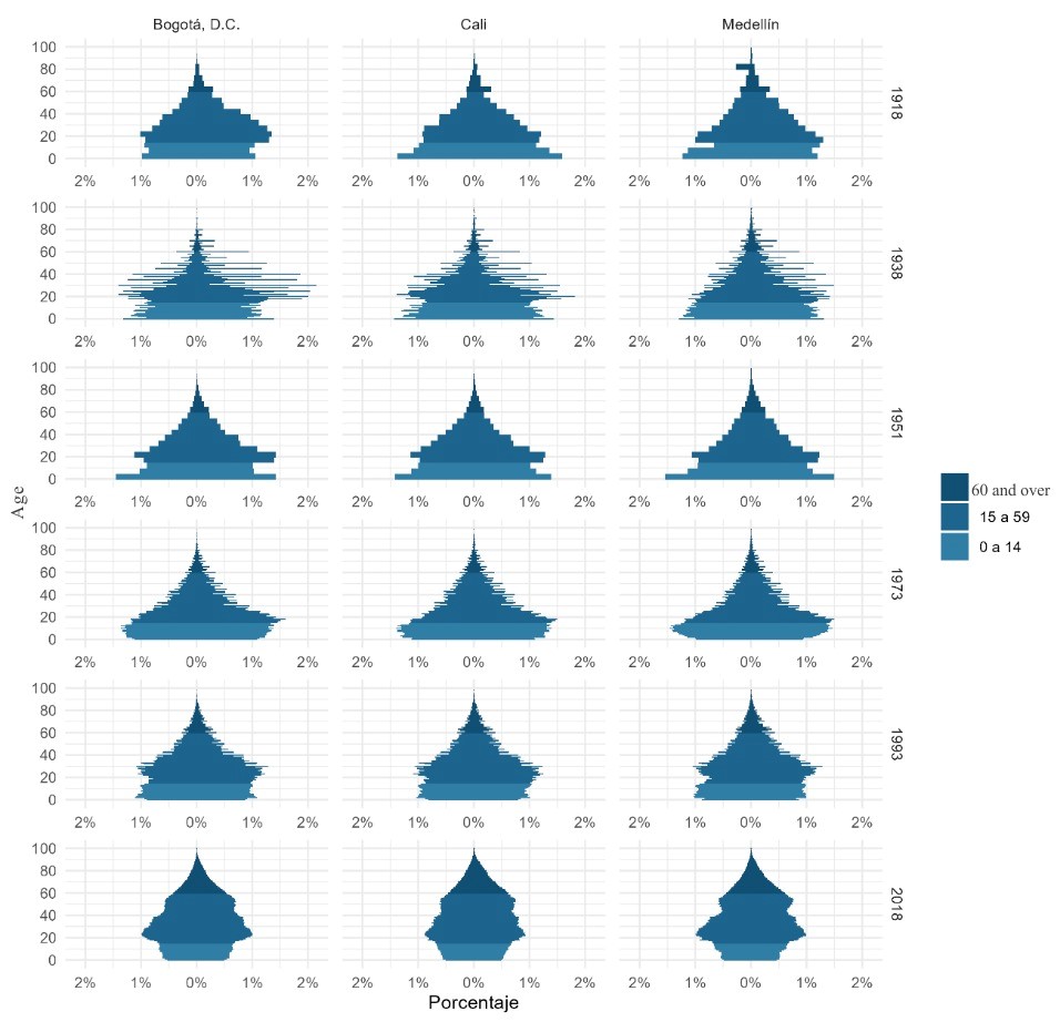 Bogotá, Cali and Medellín: population structures by age and sex (1918-2018)